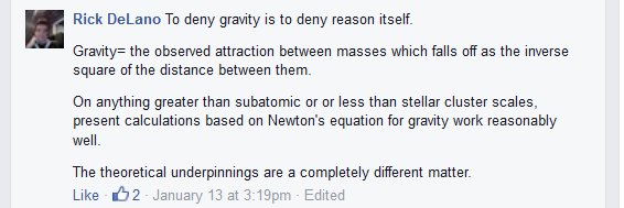 New geocentrists such as Robert Sungenis and Rick DeLano affirm the existence of gravity and the inverse square law, that the effects of gravity decline “in inverse proportion to the square of the distance to the source” (Wikipedia). Here’s Rick: